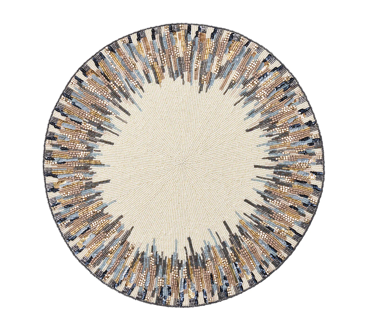 The Diadem Placemat merges classic craftsmanship with elevated design, encircling each plate in a beaded border that exudes quiet regalness. Soft greys, periwinkle, and matte metallics add a subtle sheen, making this chic palette perfect for celebratory gatherings. It is an elegant charmer that will make your table shine.