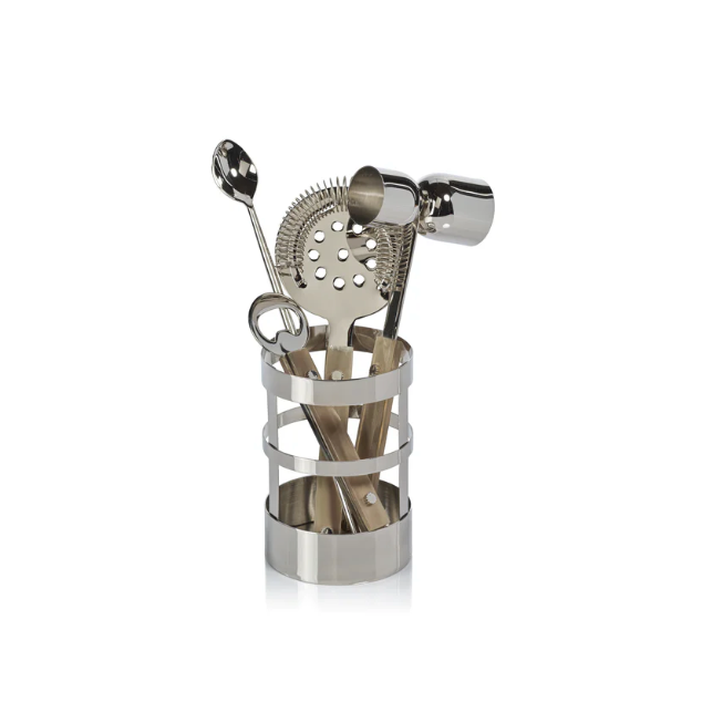 This sleek and modern bar tool set includes essential pieces for crafting cocktails, all organized in a polished metal holder. With a strainer, jigger, bottle opener, spoon, and holder, this set combines functionality with a stylish design, perfect for any home bar or entertaining space.