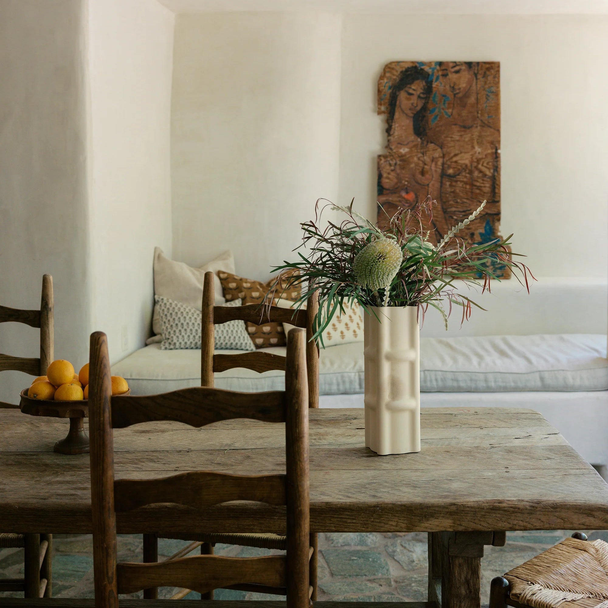 Faye is a seamless union of coil and slab forms. Thoughtfully slip-cast, this piece elegantly bridges the two worlds together. With its scallop-like symmetry, Faye balances restraint and organic beauty—an ode to both structure and softness. A statement piece, whether adorned with fresh flowers or not, its silhouette invites you to experience its subtle rhythm, embodying the essence of sculptural refinement.