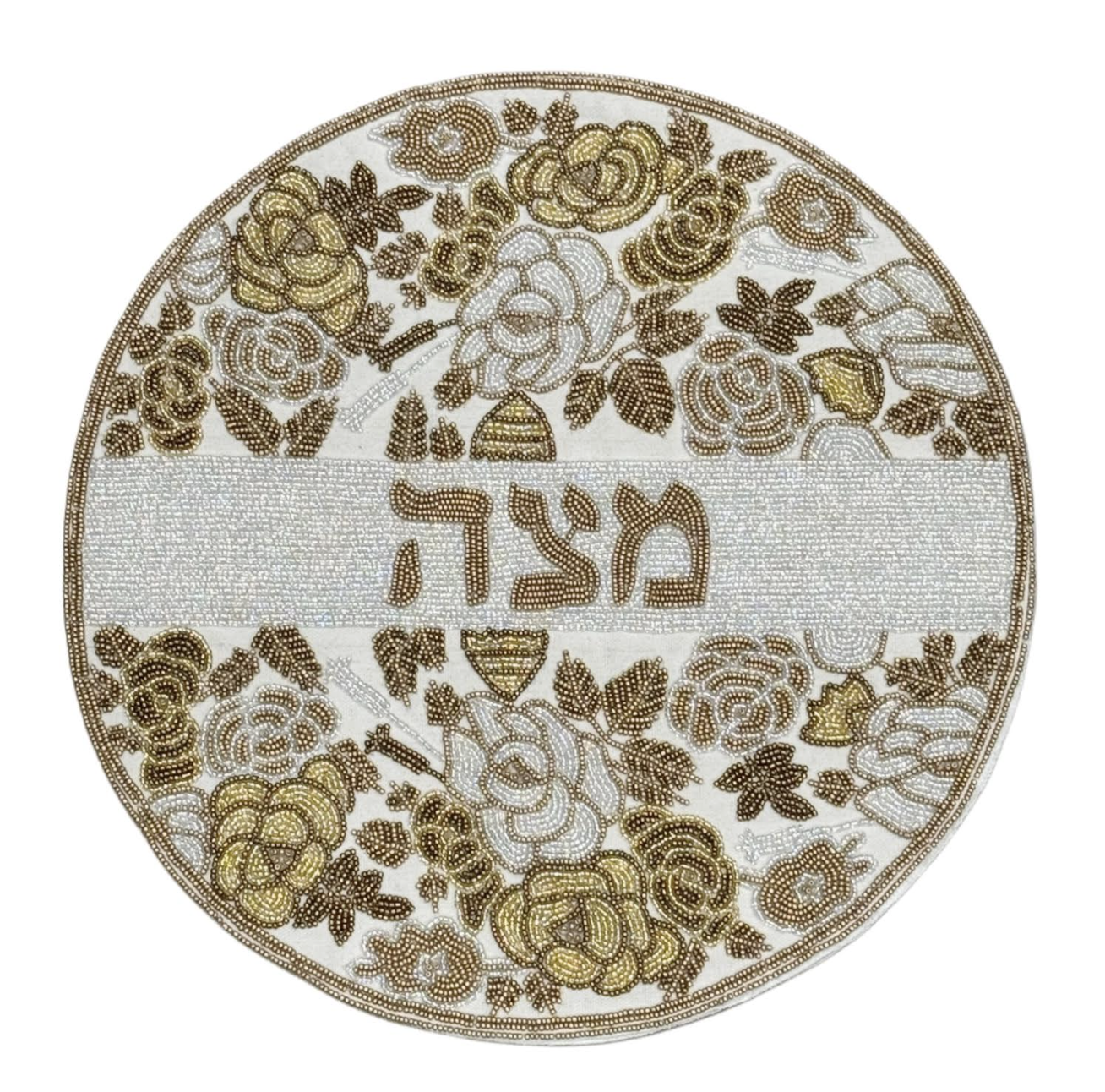Elevate your Seder table with this stunning hand-beaded matzah cover, crafted with meticulous attention to detail. Featuring an exquisite floral design in a sophisticated gold and white mix, each piece is individually beaded to create a truly one-of-a-kind look. The intricate beadwork catches the light beautifully, making it an eye-catching centerpiece that celebrates both tradition and artistry. Perfect for adding a touch of elegance and personal style to your holiday gathering.