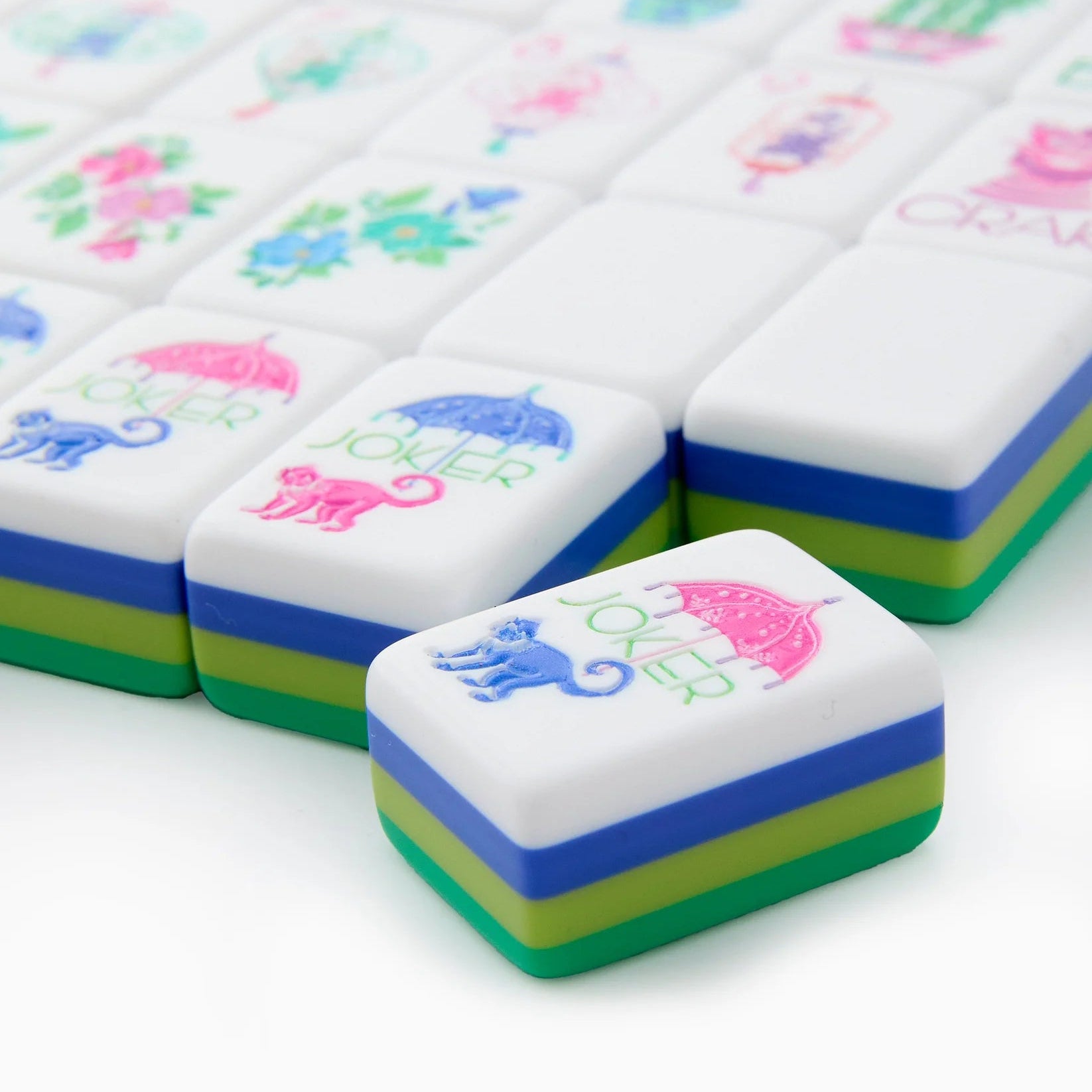 Inspired by the beauty of the great outdoors, the Jasmine Tiles bring a refreshing and vibrant touch to your mahjong game. Featuring a harmonious blend of kelly green, muted lime, and deep blue, this nature-inspired colorway captures the essence of lush gardens, rolling meadows, and tranquil waters. Whether you're playing under twinkling patio lights or gathered around the table with friends, the Jasmine Tiles infuse every game with a breath of fresh air and timeless elegance.