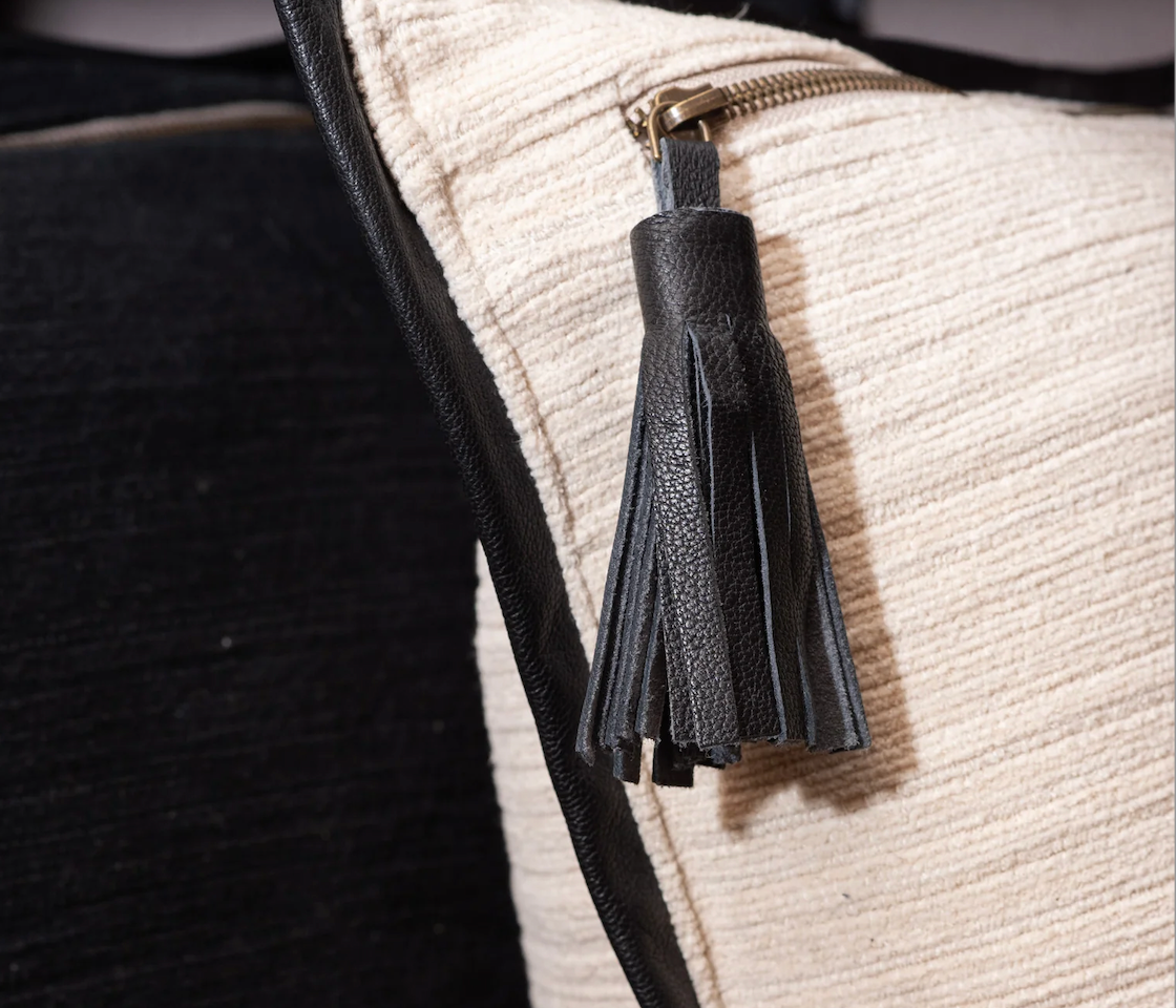 Crafted from heavyweight ribbed cotton chenille, this pillow is bordered with supple sheep leather for a refined, classic look. A chunky metal zipper and oversized leather tassel add a modern edge, blending timeless texture with contemporary detail. Both stylish and versatile, it’s a statement accent that elevates any space.