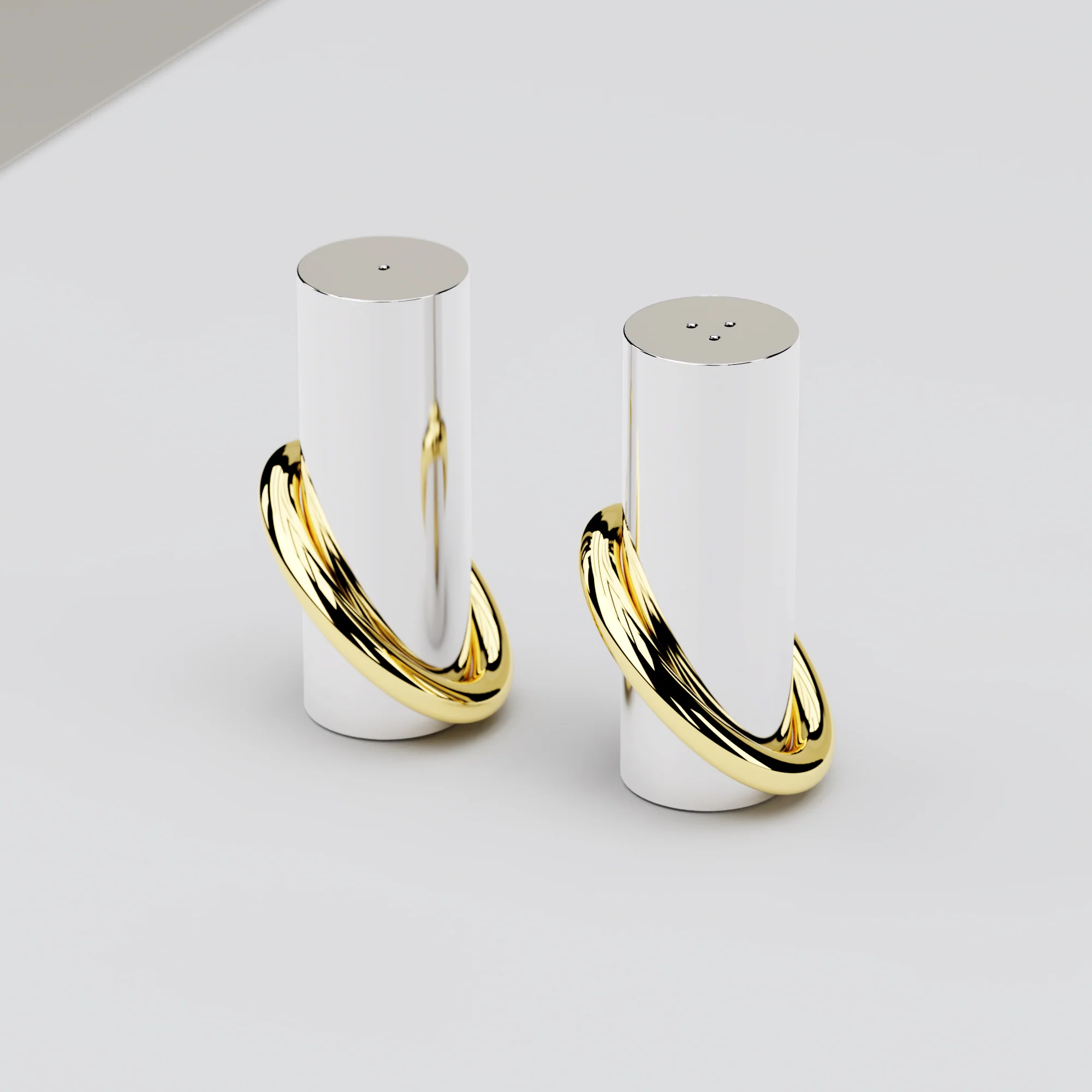 The Ring Salt and Pepper shakers are crafted from hand-polished stainless steel and solid brass, these elegant shakers blend style with function. Designed to adorn your kitchen and dining table alike, they elevate any meal.
