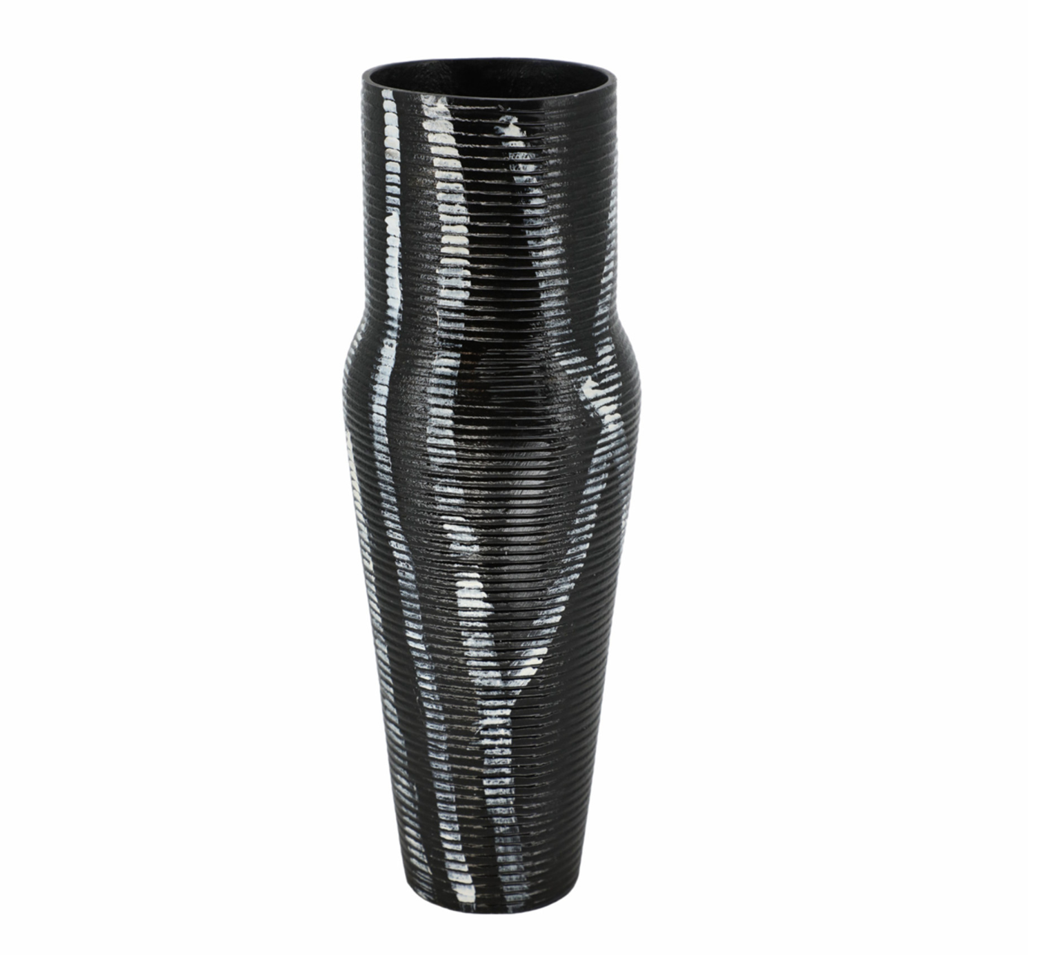 Sculptural grey vase featuring bold black ribbed detailing accented with crisp white elements. The dimensional ribbed texture creates visual depth and tactile interest, while the contrasting palette adds contemporary sophistication to any interior. Perfect for displaying fresh or dried botanicals, this piece serves as a striking standalone accent or complementary addition to curated shelf styling.