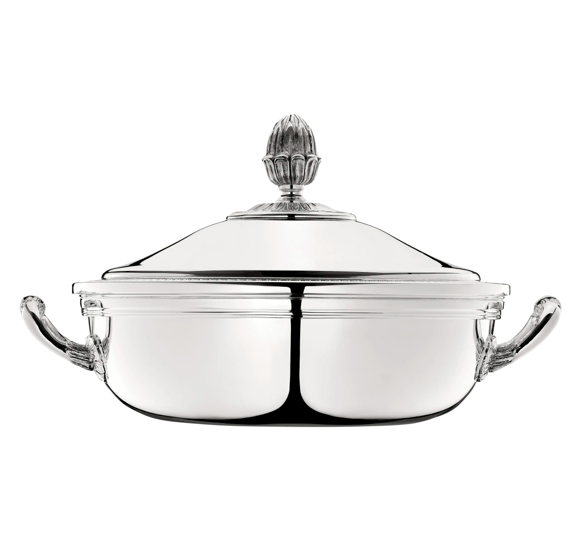 Set an elegant table with the silver plated and lidded vegetable dish in the Malmaison pattern. One of Christofle's most historic patterns, Malmaison typifies the Empire style, with its frieze of delicate palm and lotus leaves and symmetrical design. The name is a nod to the Chateau de la Malmaison, a favored Parisian residence of Napoleon Bonaparte and Empress Josephine.