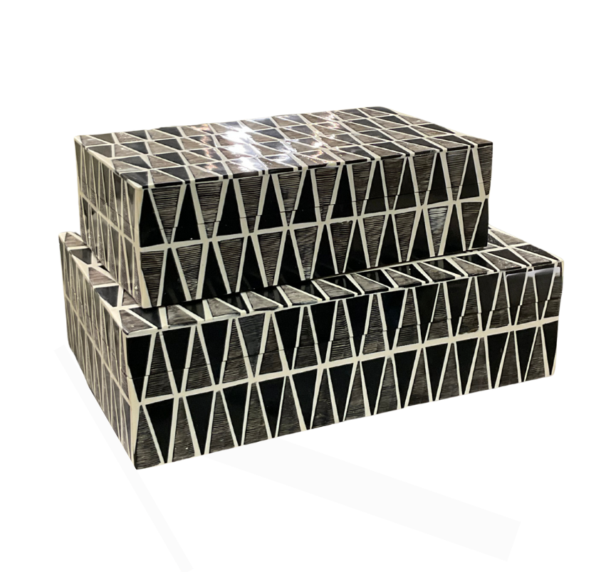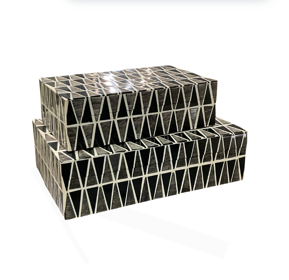 The Mystic Bone Box features a bold geometric design, meticulously handcrafted in shades of black, brown, and ivory. This striking piece combines artistry and craftsmanship, bringing a refined touch to any space. Its unique pattern and quality materials make it an exceptional addition to your décor collection.